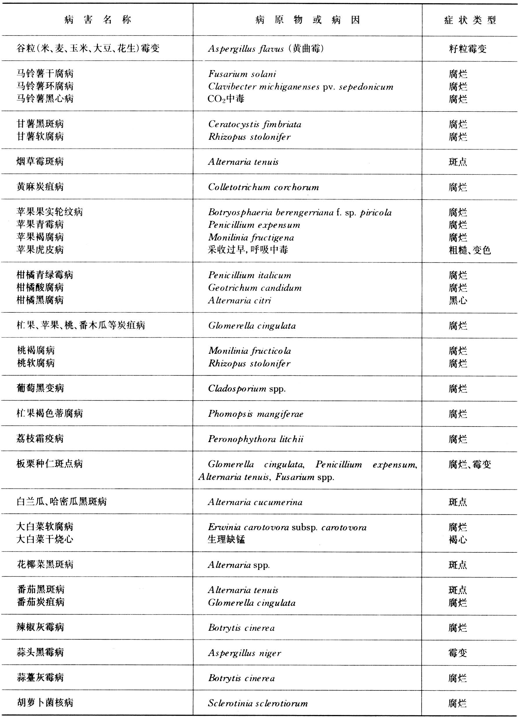 收获后病害有非侵染性和侵染性两类。中国重要的收获后病害有30多种(见表)。