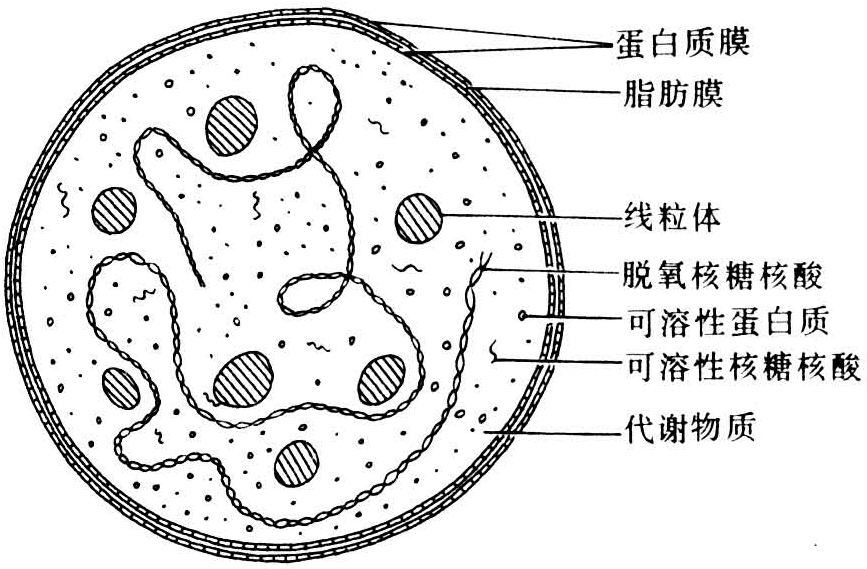 病原物为类菌原体(MLO),属软球菌纲(M allicntes)菌原体目(M ycoplasmatales)。病原物无细胞壁,仅以厚度约10纳米的三层单位膜为界,呈球形、卵形或不规则形,其大小约80~800纳米,内含DNA、RNA和核糖核蛋白等,其模式结构(见图)。病原物主要分布在病株组织的筛管细胞和介体昆虫的中肠以及唾液腺细胞汁中,以二均分裂繁殖,对四环素族抗菌素敏感。生长需甾醇和微碱性环境,耐渗透压。除水稻外,尚可侵染看麦娘(Alopecurus acqualis)、甜茅(Glyceria acutiflora)和一种野生稻(Oryza cuben-sis)。发病程度取决于田间病原物数量和介体昆虫传病代次的带病虫量,如双季稻区早稻病原虫量大,则晚稻发病重。