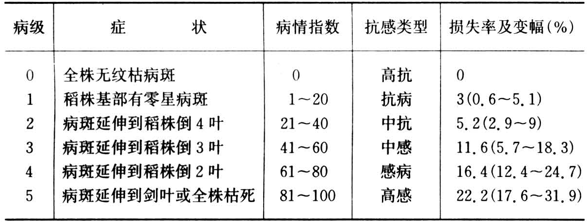 表中所示,中抗类型品种,病斑一般只延伸到稻株倒4叶(病情指数<40),对产量影响不大,这类品种不需用药保产,但中感类型品种,病斑延伸到倒3叶时(病情指数>40),对产量有影响,需用药剂保护。因此可以将倒4叶作为抗病和感病的区分线以及用药剂防治的生育指标。