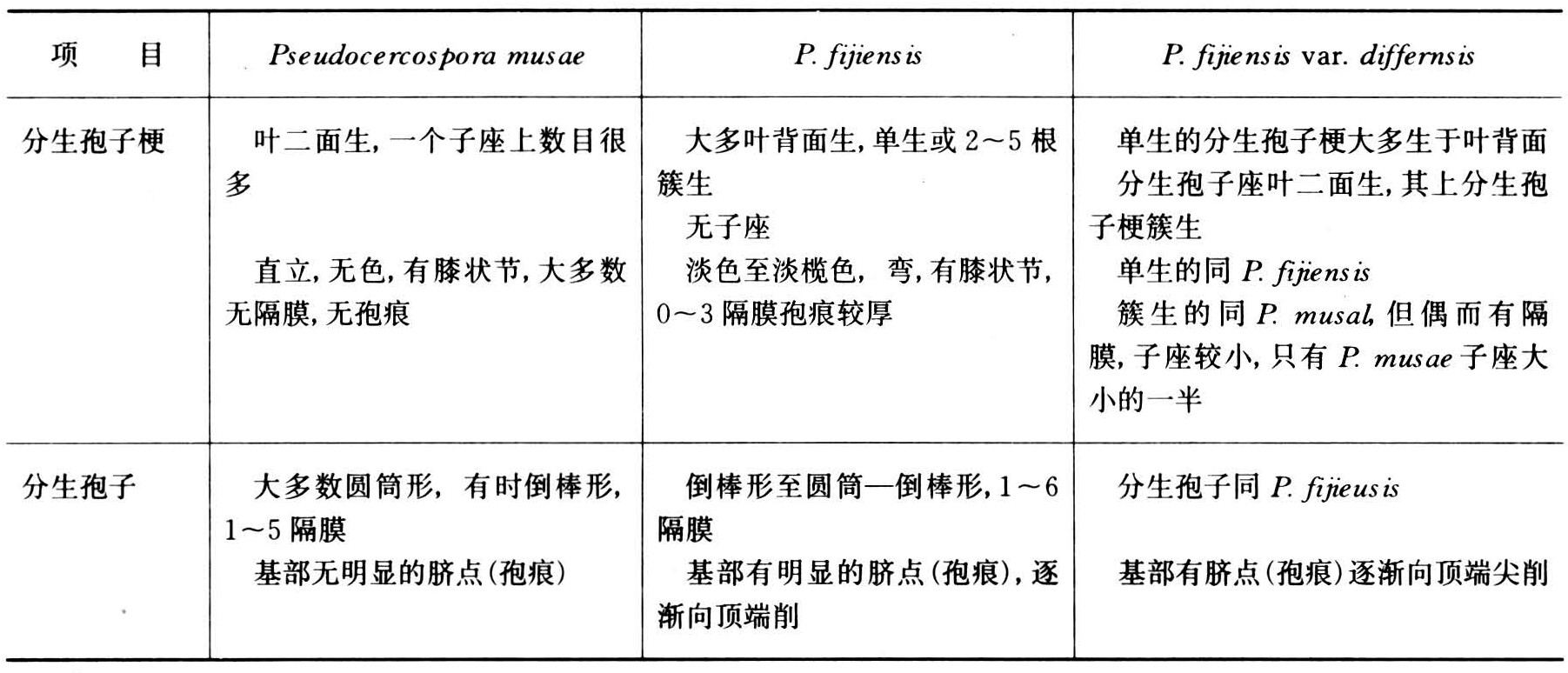 主要由假尾孢菌引起包括:①褐条叶枯病,又称“黄死病,发生普遍,叶片病斑呈椭圆形或长条形,暗褐色,初期叶正面症状明显,发生多时,叶片干枯,叶柄及果轴折断。②黑条叶枯病,最早发现于斐济,分布于南太平洋多数岛屿及夏威夷、马来西亚、菲律宾、泰国,中国主要发生于台湾,叶片上病斑呈黑色,初期在叶背面明显,后期中心呈灰色,具淡褐色边缘和褪绿晕围。③黑死病,报道于南太平洋岛屿及洪都拉斯,中国主要发生于台湾,症状与黑条叶枯病类似,但扩展更快,危害性更大,病原菌形态亦略有差别,分生孢子梗通常单生(病斑在叶背面尤其如此)或2~4根簇生于小子座上。三种病害病原物的有性态依次为香蕉生球腔菌(Mycosphaerella musicola)、斐济球腔菌(M.fijiensis)、斐济球腔菌双型变种(M.fijiensis var.difformis)子囊菌,座囊菌目,无性态依次为香蕉假尾孢(Pseudocercospora musae)、斐济假尾孢(P.fijien-sis)、斐济假尾孢双型变种(P.fijiensis var.diffor-mis),均属半知菌,丝孢目。