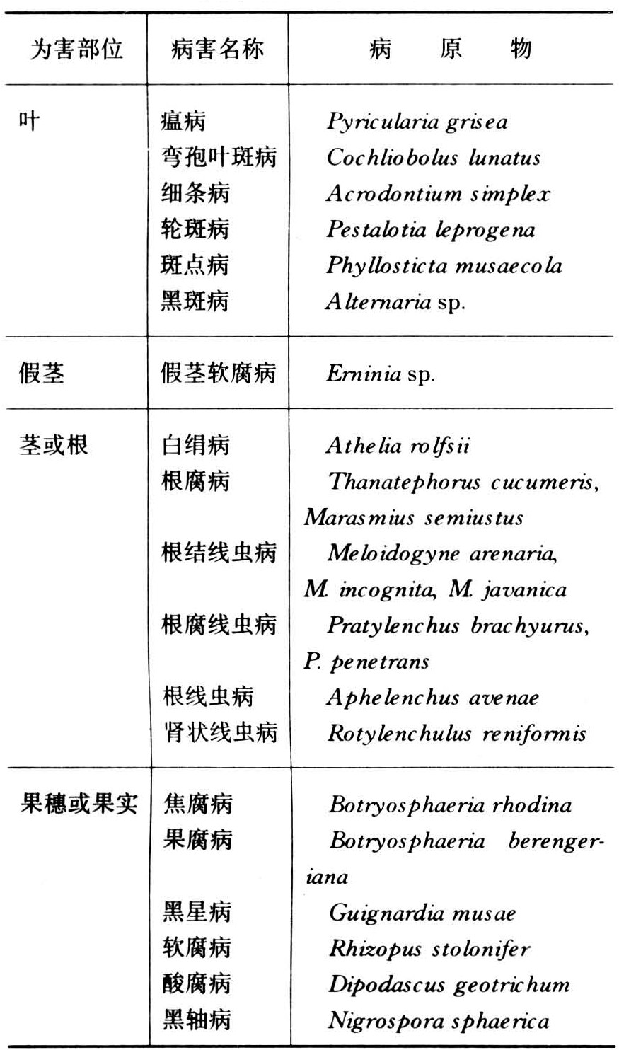 全世界报道约100种,至1991年中国有50多种。重要的病害有香蕉束顶病、枯萎病、根腐病、花叶心腐病、叶斑类病害及贮运中的炭疽病和冠腐病。