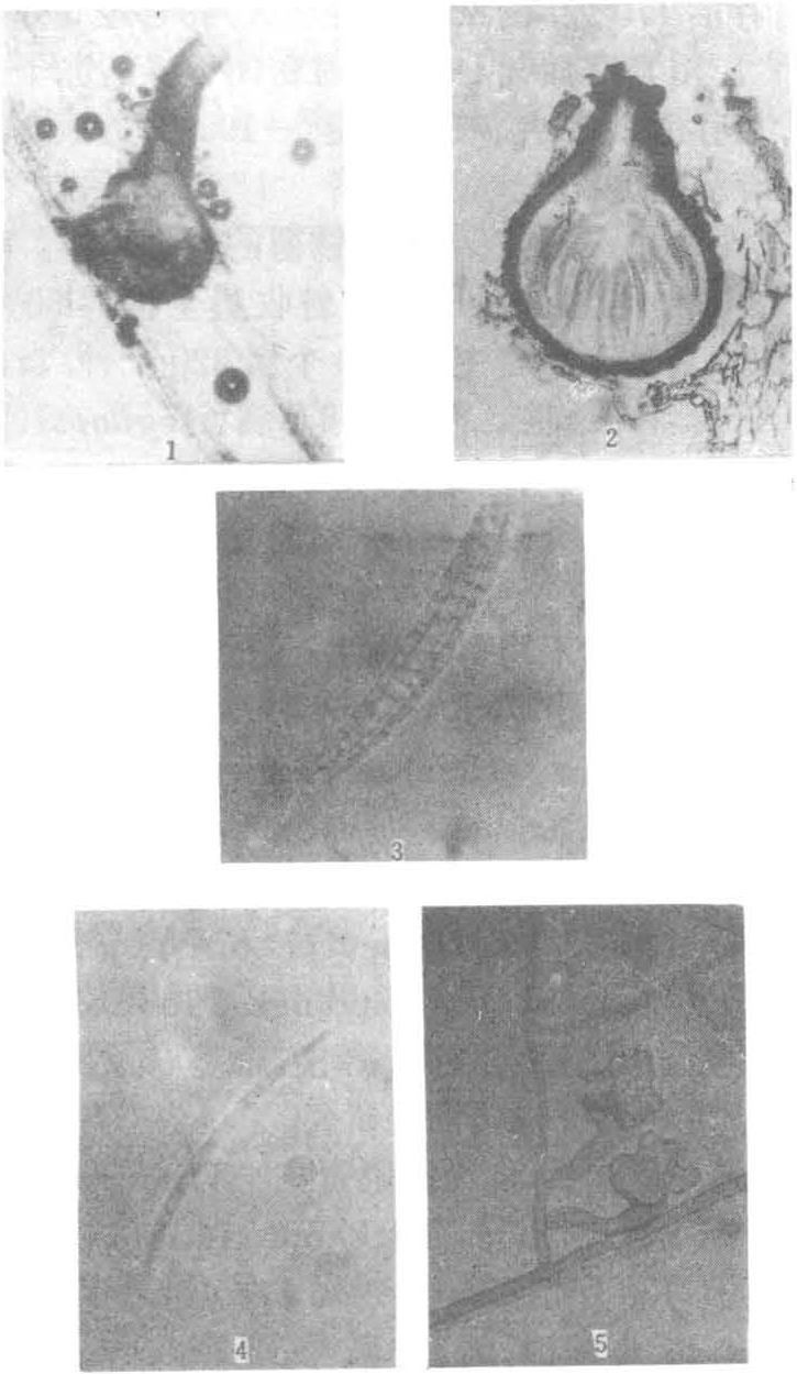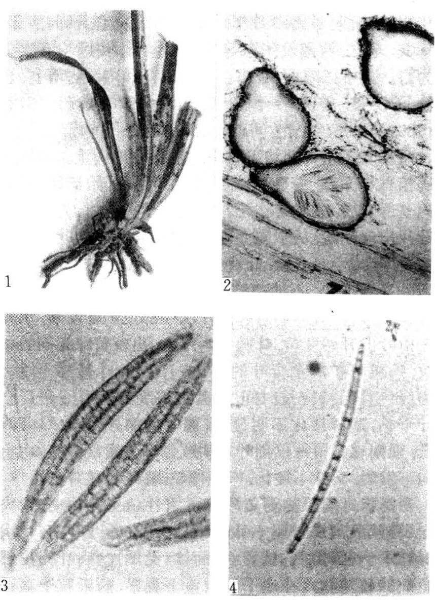 病原菌为禾顶囊壳禾谷变种(G.graminis var.graminis)和小麦变种[Gaeumannomyces gra-minis(Sacc.)Arx et Oliver var.tritici],属子囊菌,球壳目。其无性态在自然条件下尚未发现。小麦变种的子囊壳群集或散生于衰老病株茎基部叶鞘内侧的菌丝束上,烧瓶状,具长颈,黑色,周围具茸毛状菌丝,子囊壳大小为385~771×297~505(微米);子囊棒状、无色,大小为61~102×8~14(微米),具短柄,平行排列于子囊腔内,子囊间早期具拟侧丝,后期消失,接近成熟时子囊壁消解,仅存顶盖;子囊孢子分散或成束排列,线形,稍弯,无色透明,大小为53~92×3.1~5.4(微米),未成熟孢子隔膜不明显,内含许多油球,成熟后具3~7个假隔膜(多数5个)(图1),在水滴中以及1%琼脂膜上或甘油水片上萌发,孢子一端或两端同时伸出芽管。成熟的营养菌丝栗褐色,隔膜较稀疏,多呈锐角分枝,主枝和侧枝交界处各生一隔膜。在人工培养基上,产生新月形,无隔、无色透明的瓶梗孢子,大小为5~7.5×2.5(微米)。在Barnett培养基或PDA培养基上,菌丝为灰黑色,菌丝束明显,菌落边缘的菌丝常向中心反卷,人工培养易产生子囊壳。对小麦、大麦致病力强,对黑麦、燕麦致病力弱。