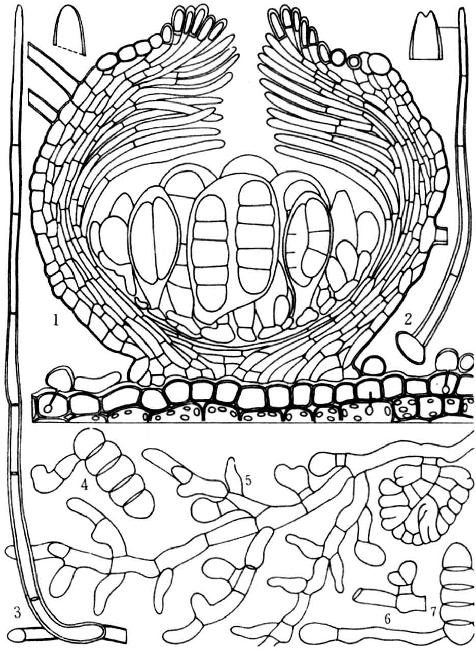 菌丝褐色至深褐色,平直、波状或弯曲,多次单侧分枝或叉状分枝。菌丝细胞短形至柱形,壁光滑,其上生营养器官和不孕器官,主要有:①头状附着枝(capitate hyphopo-dium)。通常由两个细胞组成。上部的大型细胞称顶细胞,圆形至不规则圆形,边缘整齐或有裂隙,中部有圆形透明孔与纤细的菌丝联接,下端有深入寄主皮层细胞内的球形或卵形吸器。顶细胞的下端联接一个(少数2个)矩形、楔形或柱形的柄细胞,连接于菌丝上,并参与一切代谢活动。②瓶状附着枝(mucronate hyphopodium)。单细胞,瓶状或锥状,互生或对生于菌丝的一段或与头状附着枝间生于同一菌丝上。③菌丝体刚毛(mycelial seta)。生于菌丝细胞上的毛状不孕器官,直或弯曲,黄褐色至深褐色,有或无横隔膜,顶端尖锐至钝圆,不分枝,齿状,叉状分枝或反复分枝,小枝顶端多尖锐、平直或卷曲,散生于菌枝上或围绕子囊壳盘基着生。