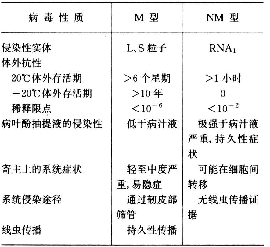 在自然条件下,各成员存在两种类型分离物,即M和NM型。M型分离物又称稳定型或正常型分离物,它的性质稳定,汁液传播,含有L和S粒子。NM型分离物又称不稳定型或缺陷型分离物,其侵染性实体是RNA1,无蛋白质外壳,存在于自然界,也可以从M型分离物的单枯斑中分离到。烟草脆裂病毒的M和NM型分离物的性质见表。