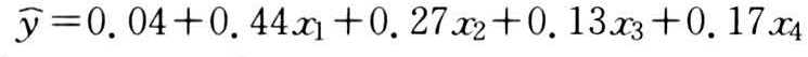 式中:>0.5为流行年,歹<0.5为轻病年。x1为始花期后三旬内降雨量,≥120毫米为(1),<120毫米为(0);x2为花期株高150厘米以上、估产1875千克/公顷为(1),低于此数为(0);x3为始花期在3月中旬以前为(1),以后为(0);x4为连作地占油菜面积三分之一以上或上一年发病率在40%以上为(1),低于此数为(0);病害y≥30%为(1),<30%为(0)。
