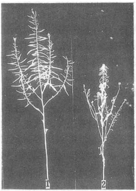 油菜缺硼后,其叶绿素含量较正常的油菜降低30%~60%,幼叶出现白化现象,老叶变暗绿或黄色并产生花青素。叶中转化酶的水解活性降低,造成蔗糖在叶中积累,阻碍向根和繁殖器官运转。病株蒸腾作用强度较正常植株降低82%~103%。硼对分生组织的分化有很大影响,缺硼后首先表现在根尖和主茎生长点萎缩坏死。在繁殖生长阶段需要较多的硼素营养,因为硼对花粉和花粉中生殖细胞的分化、子房和胚珠的发育分化、授精过程、胚芽和胚乳的发育起着重要作用,因此硼对提高油菜籽的产量和品质影响很大。