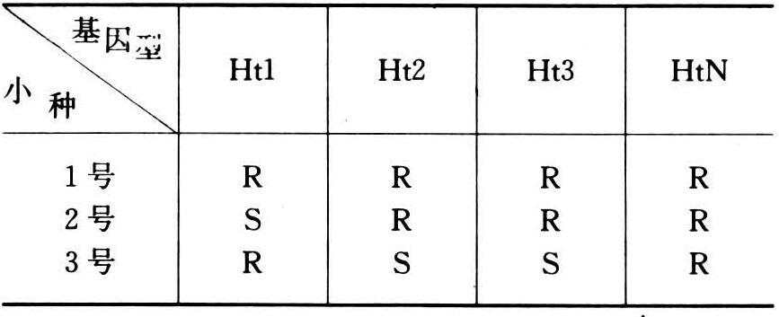病菌除为害玉米外,尚能侵染高粱、苏丹草(Sorghum sudanense)、约翰逊草(Sorghum hale-pense)、野生玉米等禾本科植物。多数研究者根据病菌对寄主的致病力区分为不同的专化型。凡能侵染玉米、高粱、苏丹草、约翰逊草的病菌称为大斑病凸脐蠕孢高粱专化型,只侵染玉米的称为大斑病凸脐蠕孢玉米专化型。经交互接种证明,两个专化型是不能互相侵染的。在玉米专化型中,根据含有显性单基因Ht1、Ht2玉米毒力的有无,又可区分为两个生理小种,定名为1号和2号小种。1号小种对具有Ht1、Ht2基因玉米无致病力,只引致褪绿斑,不形成孢子;其毒力公式为Ht1·Ht2/O。而2号小种对含有Ht1基因玉米具有致病力,引致萎蔫斑,并产生大量孢子;其毒力公式为Ht1/Ht2。1号小种广泛分布于世界各地,而2号小种则于1974年在美国夏威夷首次发现,中国辽宁省在1983年也有报道。以后在美国的伊利诺州(Illinois)和南卡罗州(South Carolina)(1980)以及中国的台湾省(1988)先后发现有3号小种。划分这三个小种的玉米基因型(见表)。