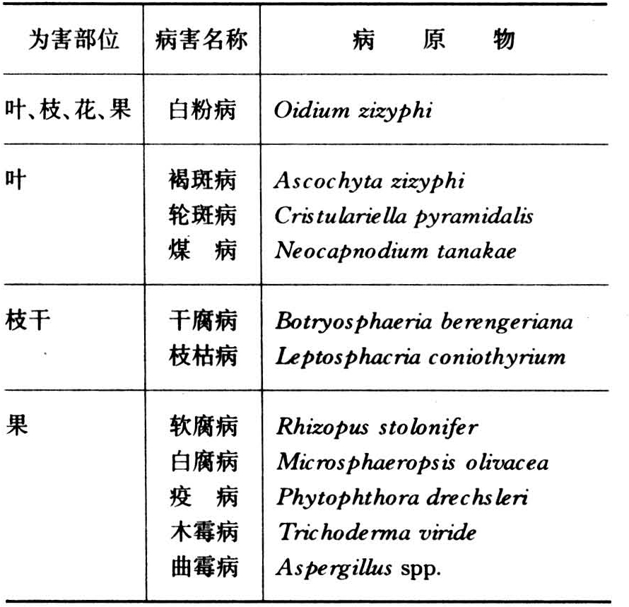 全世界已知10余种(不包括椰枣病害),中国已报道10余种。其中最重要的是枣疯病、锈病及炭疽病。