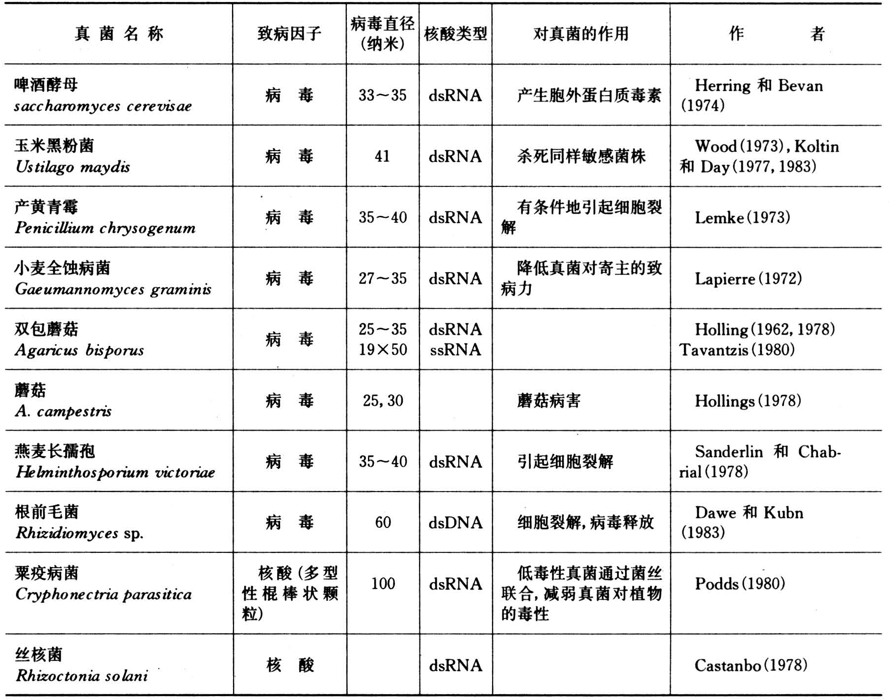 在真菌中存在和复制的病毒。迄今已报道的真菌病毒或病毒状粒子涉及真菌的各大类约30个属、100多个种。1962年英国M.荷林(M.Hollings)首先在电镜下观察到感病蘑菇的病毒粒子。大多数真菌病毒是不致病的。但栽培蘑菇因病毒引起的顶死病,褐化病等已造成经济上的损失。表中列出已发现真菌病毒或dsRNA对寄主有致病作用的种类。