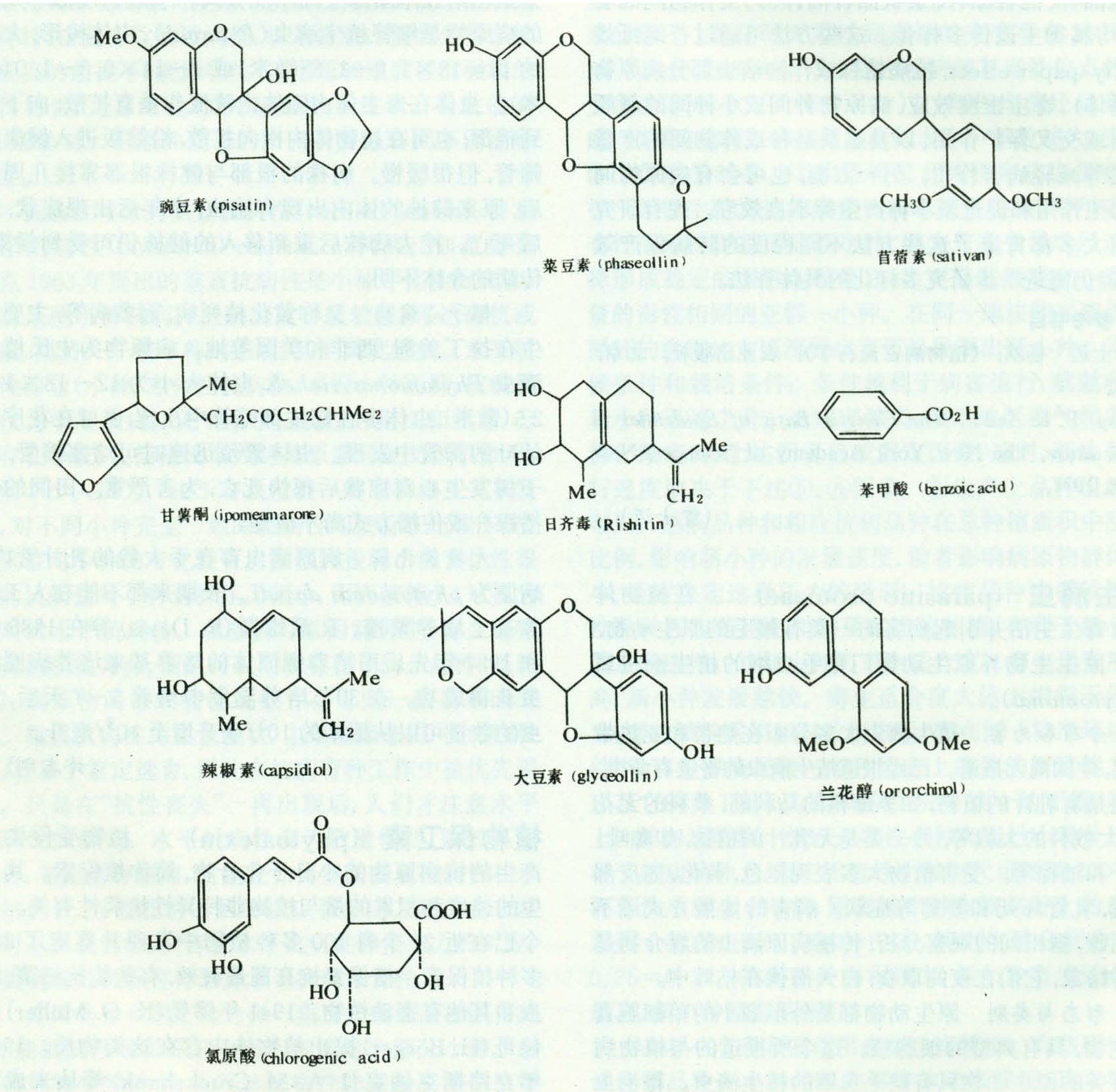 植保素的种类和寄主的分类学相关,在植物科这一级有一定的专化性,一般一个科的植物产生一定类型的植保素。但个别科也能产生不同类型的植保素。如豆科植物中已发现有100种植保素,其中84种为黄酮类。茄科植物中已发现43种植保素,其中34种为萜类。在藜科、锦葵科、伞形花科、旋花科、菊科、兰科中也分离鉴定了植保素。已知的植保素多数结构较复杂。多属于黄酮类和萜类。代表性植保素结构(图1)。