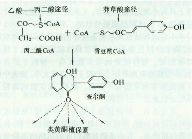 主要存在于豆科植物中,有代表性的是豌豆素、菜豆素、大豆素和苜蓿素等。豌豆感染褐腐病积累豌豆素。菜豆感染炭疽病或立枯病后,在体内很快形成菜豆素。大豆对大雄疫霉的抗性,部分是由于寄主组织中积累了大豆素。致病菌刺激形成的大豆素的能力大于非致病菌;抗病品种较感病品种形成更多的大豆素。黄酮类植保素在体内的生物合成途径是乙酸—丙二酸途径和莽草酸途径混合形成。丙二酰辅酶A和香豆酰辅酶A经黄烷酮合成酶加工成查尔酮,然后由查尔酮再衍生为各种黄酮类(图2)。