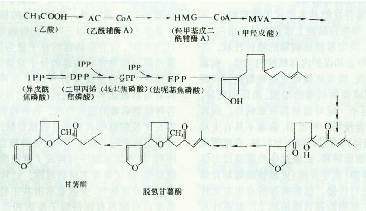主要从茄科的马铃薯和旋花科的甘薯中获得。典型的有甘薯酮、日齐素和辣椒素等。甘薯感染黑斑病菌发生黑斑病后,体内萜类植保素增加,其量和染病部位的距离有关,越接近感病部位含量越多。抗病性强的品种较抗病性弱的品种含量高。马铃薯块茎感染马铃薯晚疫病菌后,可分离得到日齐素,在块茎及叶柄组织中,抗病品种较感病品种积累速度更快,量更大。萜类植保素的生物合成途径是乙酸—甲瓦龙酸途径。甘薯酮的合成途径图3。