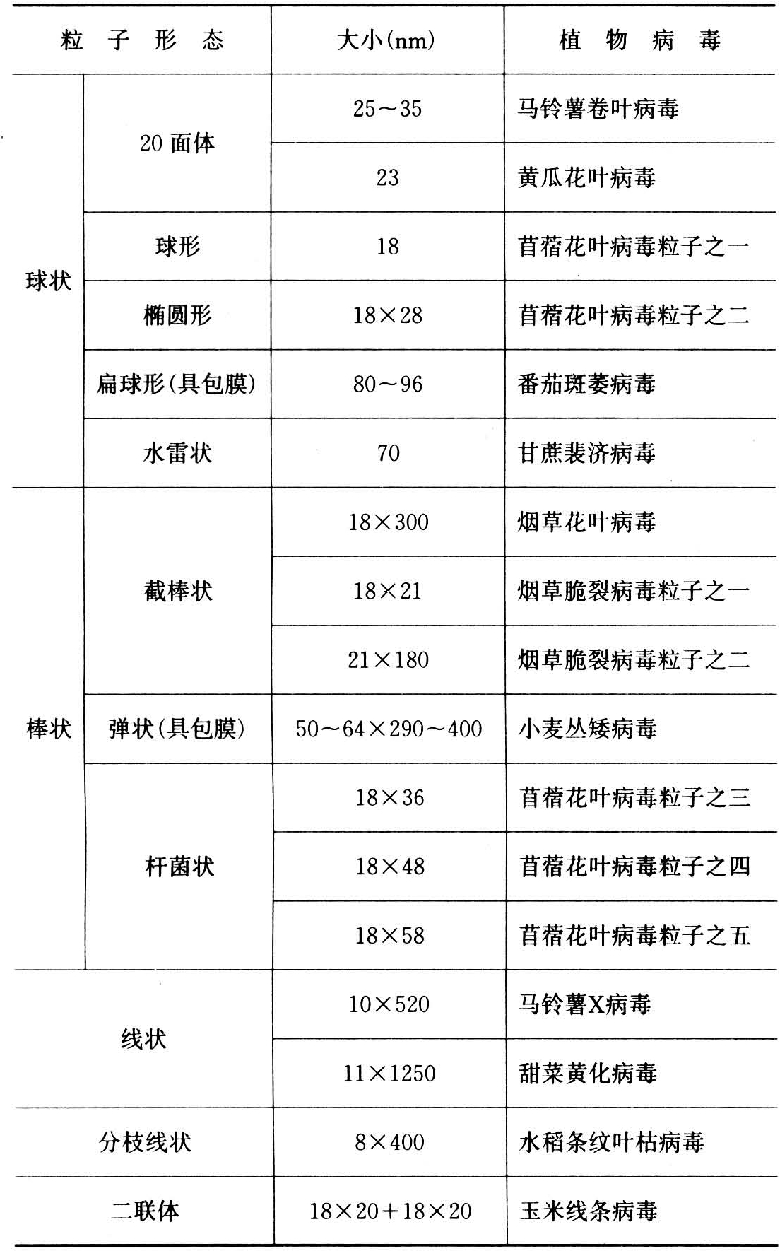 随着电子显微镜和染色技术等迅速发展,过去认为是球状的粒子,实际上大多是20面体,正20面体是由20个三角形的面、12个顶角和30个条边对称构成。70年代以来发现甘蔗斐济病毒20面体的几个顶角上具有小突起,似水雷状;玉米线条病毒是由两个不完整的20面体联结成哑铃状的二联体粒子。1975年日本小金沢硕城发现水稻条纹叶枯病毒是分枝丝状粒子,两个分枝长短不一。棒状和线状粒子均属于螺旋对称构型。每种植物病毒多数仅有一种粒子形态存在,少数病毒有两种以上的粒子形态或大小,如表中烟草脆裂病毒和苜蓿花叶病毒。此外,有少数病毒粒子四周还包裹着一层包膜。