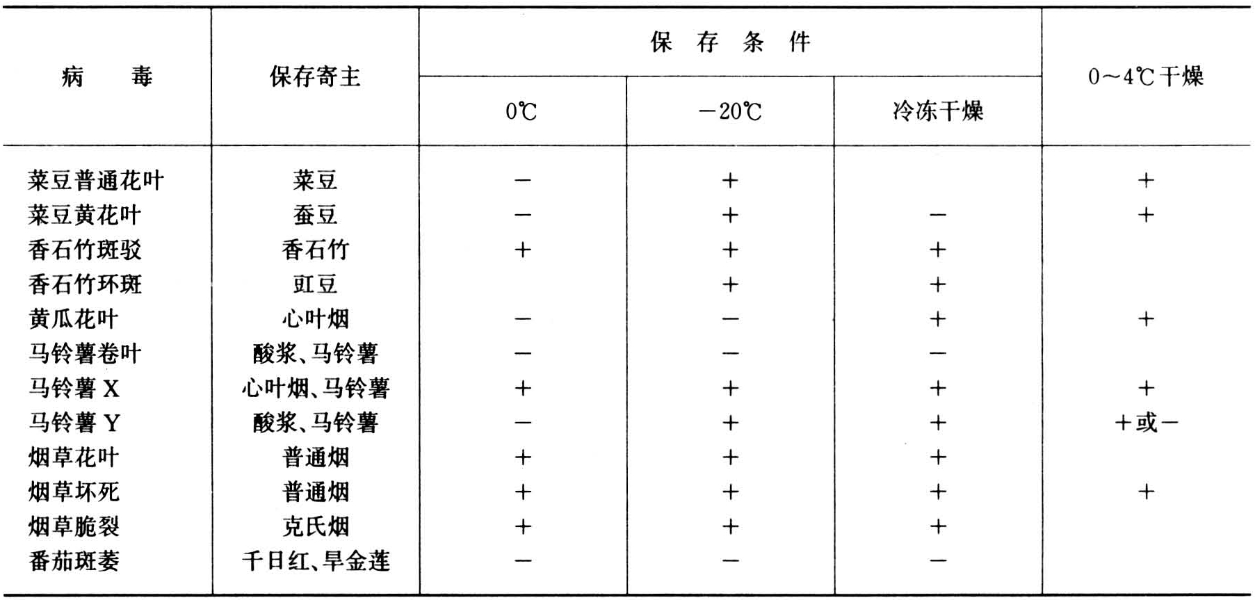 对已鉴定或研究过的植物病毒材料需要进行保存,保存的目的是维持病毒的侵染性,保持病毒的性状不发生变异和防止病毒的混杂。保存各种标准植物病毒材料,对病毒的鉴定与分类、遗传变异及侵染与复制等研究都是十分重要的。在保存过程中,病毒的侵染性往往会降低,如有的病毒能耐冰冻但不耐融化;干燥过程中溶质变浓也可引起病毒失活。加入保护剂(如甘油、乳糖、葡萄糖、蛋白胨等)有时能保护叶片或汁液中病毒的活性。