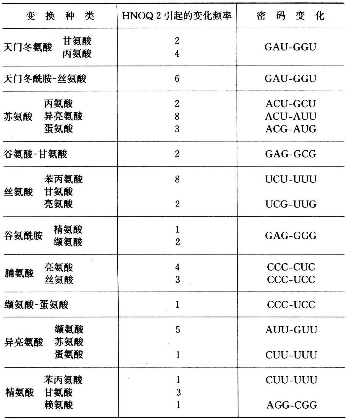对400多个TMV亚硝酸人工变异株的氨基酸分析证明有半数发生了1~3个氨基酸的变化,其中频繁观察到的氨基酸变换是:丝氨酸变为苯丙氨酸11次,脯氨酸变为亮氨酸,天门冬酰胺变为丝氨酸各10次,苏氨酸变为异亮氨酸8次,精氨酸变为甘氨酸7次。丝氨酸到苯丙氨酸,脯氨酸到亮氨酸,苏氨酸到异亮氨酸的变换是由于RNA上胞嘧啶变为尿嘧啶。天门冬酰胺变为丝氨酸,精氨酸变为甘氨酸是由于腺嘌呤到鸟嘌呤的变化(见表)。