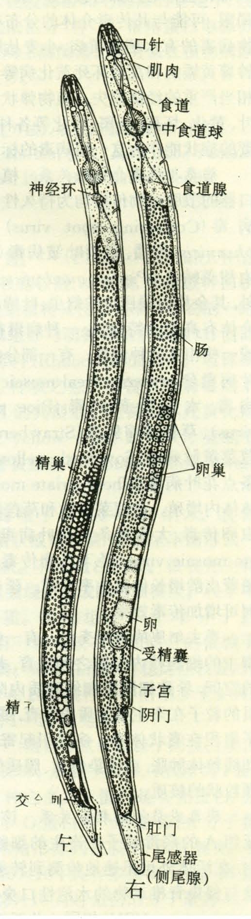 典型植物寄生线虫似线条,放大的虫体呈纺锤形或梭形,从中部向两端渐细,大致长0.2~12毫米和宽0.01~0.05毫米不等。少数类群的雌虫膨大成梨形、柠檬形、肾形、珍珠状或其它不规则囊状(图1,2)。线虫无色,不分节。虫体最前端是由唇片组成的唇部或称头部。唇片一般6枚或少于6枚。肛门以后的虫体是尾部。在头部、尾部之间的虫体称为体部。头部与其它部位往往有缢痕相隔。头内有不同角化程度的头架。在头部和尾部分别包括神经系统的侧器(amphids)、乳突(papillae)和尾感器(phasmids)等感觉器官。线虫纵向分为背区、右侧区、左侧区和腹区,两侧对称。线状线虫往往不同程度地向腹面弯曲,弯曲显著的呈弓形、C形或螺旋状等,肛门、阴门和排泄孔都在腹面。线虫的基本结构是由两条相套的体管即外体管或体壁和内体管或消化道组成。内、外体管之间为充满体液的假体腔。在体壁内除消化道外,还有生殖、神经及排泄各生理系统。生殖系统是在线虫由幼虫发育为成虫过程中逐步发展和完善起来的。线虫没有循环系统和呼吸系统。