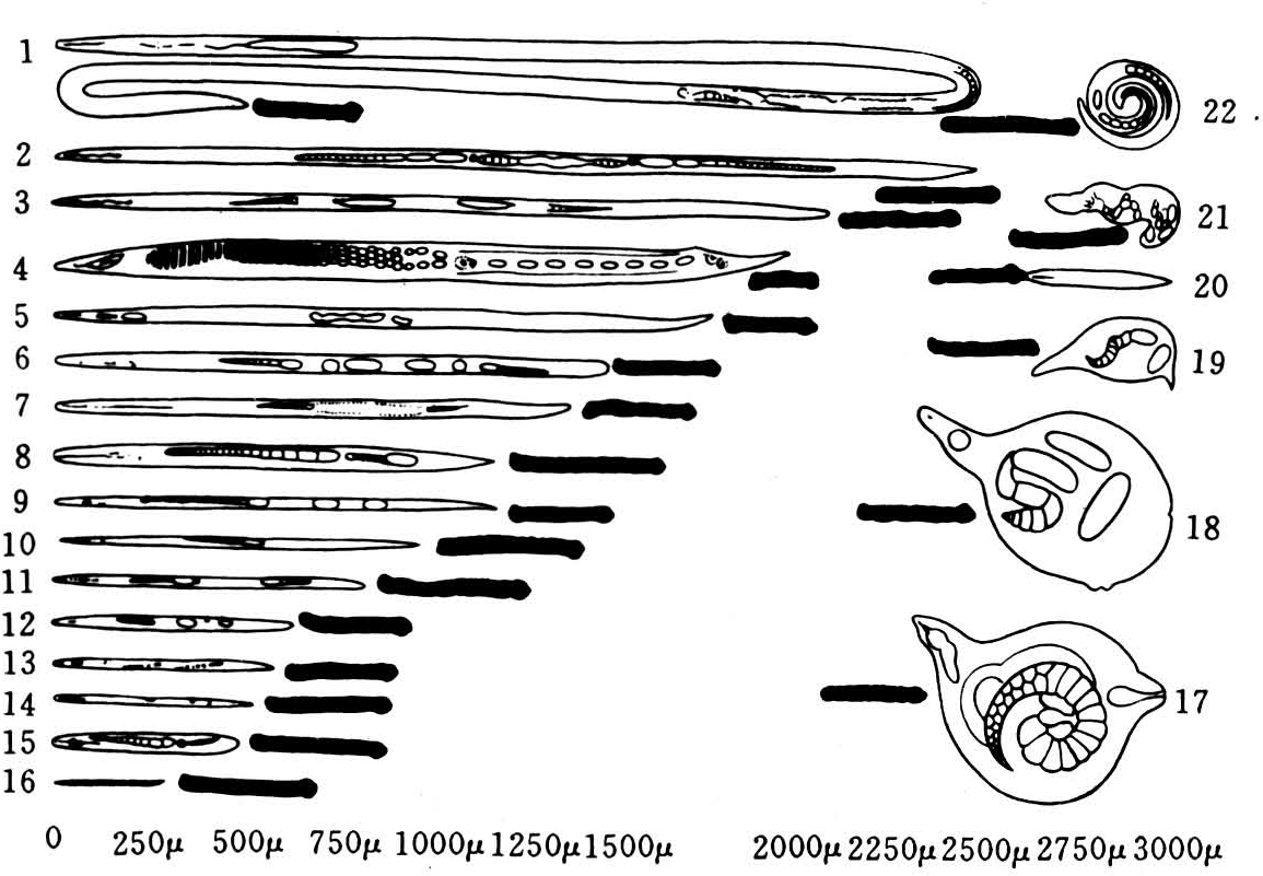 植物寄生线虫的个体发育有卵、1~4龄幼虫和成虫各个阶段。从卵发育成1龄幼虫后,每经历1阶段蜕皮1次。通过4次蜕皮,最终发育为成虫。在蜕皮过程中线虫停止活动并中断取食,蜕去体表角质膜与衬托在口腔、口针腔、食道腔、排泄管、阴道、泄殖腔及直肠内壁上的角质膜,换上由下皮分泌形成的新角质膜。在蜕皮同时线虫也更新口针前部的针锥。垫刃线虫(tyle-nchids)和滑刃线虫(aphelenchids)的第1次蜕皮在卵壳内进行,孵化出来的已是2龄幼虫,矛线线虫(dorylaimids)在1龄幼虫孵出后才进行第1次蜕皮。幼虫和成虫的外形相似,但没有生殖管,缺乏第2性特征(交合刺和阴门等)。成虫的生殖系统由幼虫体内的生殖原基细胞团逐步发育形成。植物寄生线虫生活周期的长短主要与虫种相联系,并受环境及寄主植物所制约。在合适条件下,多数植物寄生线虫完成其生活周期历时3~4个星期,少数如长针科线虫需要1年甚至1年以上发生1代。