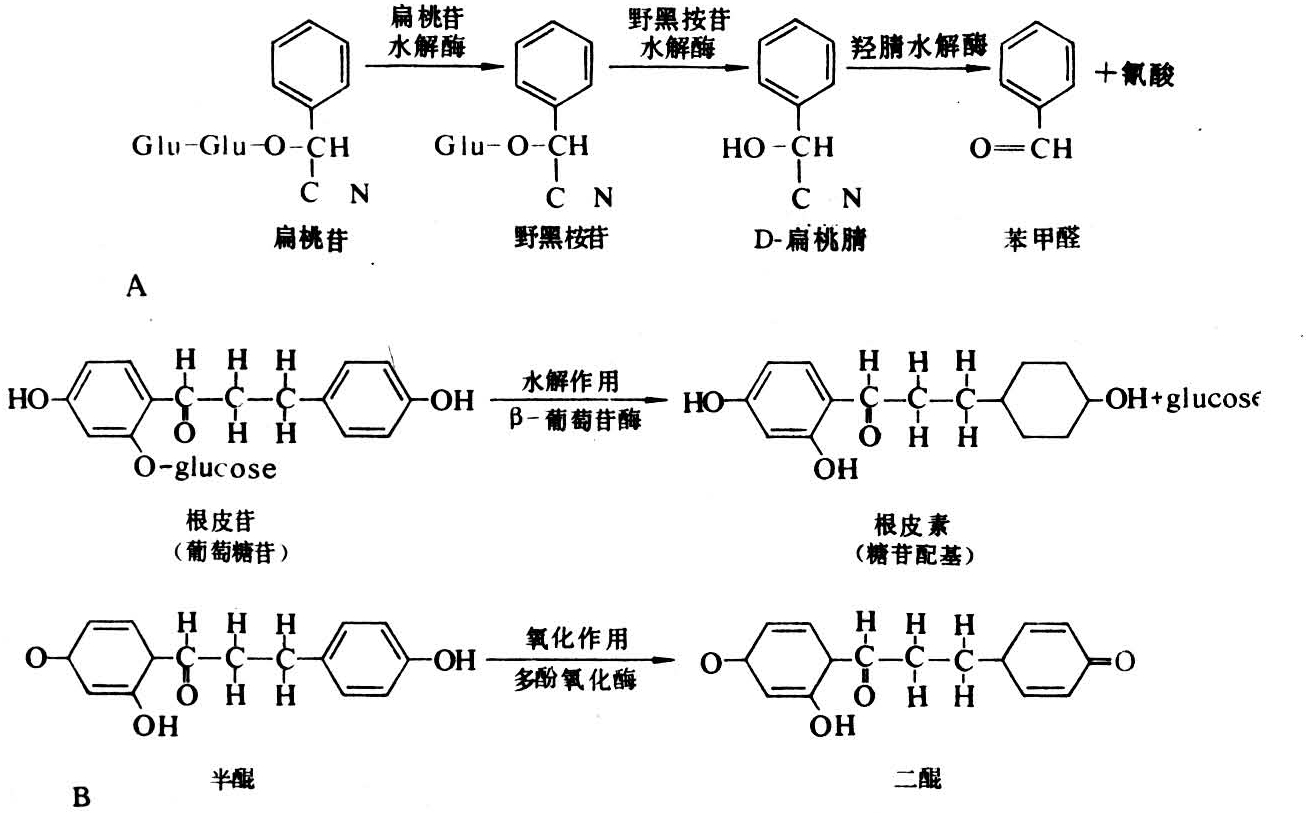 主要指由糖苷类化合物转化而成的抗菌物质。转化的途径有①糖苷酶水解,②酚氧化。葡萄糖苷是许多植物都有的一种无毒糖苷,植物受伤后由β-葡糖苷酶水解成有毒内脂。含氰糖苷存在于近千种植物中,以糖苷形式存在时是无毒的,但受物理或生物因子激发后会释放出有毒的氢氰酸。生氰过程通常需要几步酶解(见图)。熊果苷和根皮苷是不含氰的,亚麻苦苷和苦杏仁苷是含氰的,前者通过氧化产生活性物质醌,后者通过水解或醛化产生氢氰酸。亲和性菌株抗氢氰酸或将其转化为无毒代谢产物以及诱导另一种对氢氰酸不敏感的线粒体呼吸过程,常见能分解氢氰酸的酶是甲酸胺水解酶。