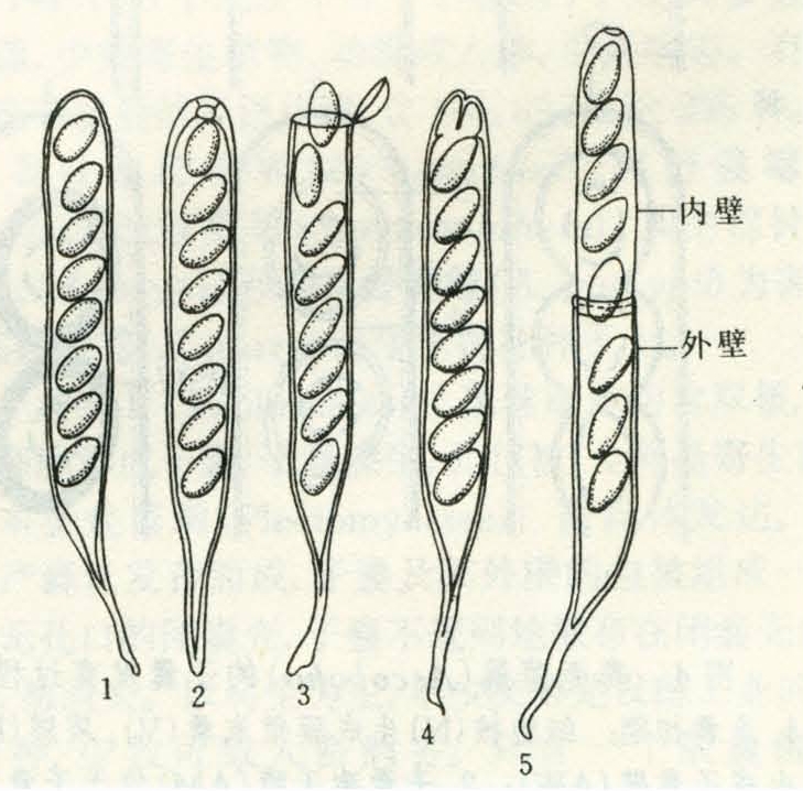 近年的研究表明子囊的结构类型较多,且与子囊孢子的释放有密切关系(图3)。通常根据囊膜的性质分为3类:①原壁子囊(protonicate)。具有一层很薄的囊膜,子囊孢子通过囊壁的破裂或消解而被释放。②单壁子囊(unitunicate)。囊膜单层,子囊孢子通过囊顶部小孔、狭缝或囊盖而主动放射。③双壁子囊(bitunicate)。囊膜双层,外层称为子囊外壁,内层称为子囊内壁。其形成过程是首先在子囊母细胞膨大时产生壁原基,尔后生成次生壁。外壁和内壁均由微纤维与非结晶体物质结合而成,差别只在于微纤维的排列方式不同。释放孢子时,外壁因无弹性而保持原位,仅顶端破裂,内壁因有较大的弹性常延伸超出外壁顶端,长度为子囊的2~3倍,孢子通过内壁顶端小孔主动放射出来(图3~5)。子囊的类型是分类的重要特征。