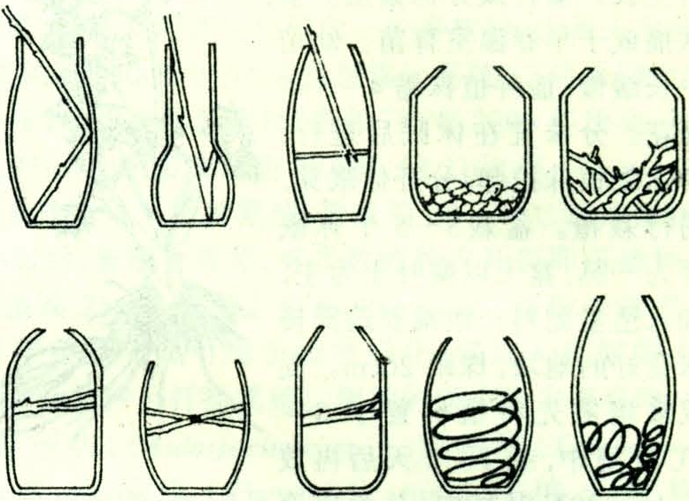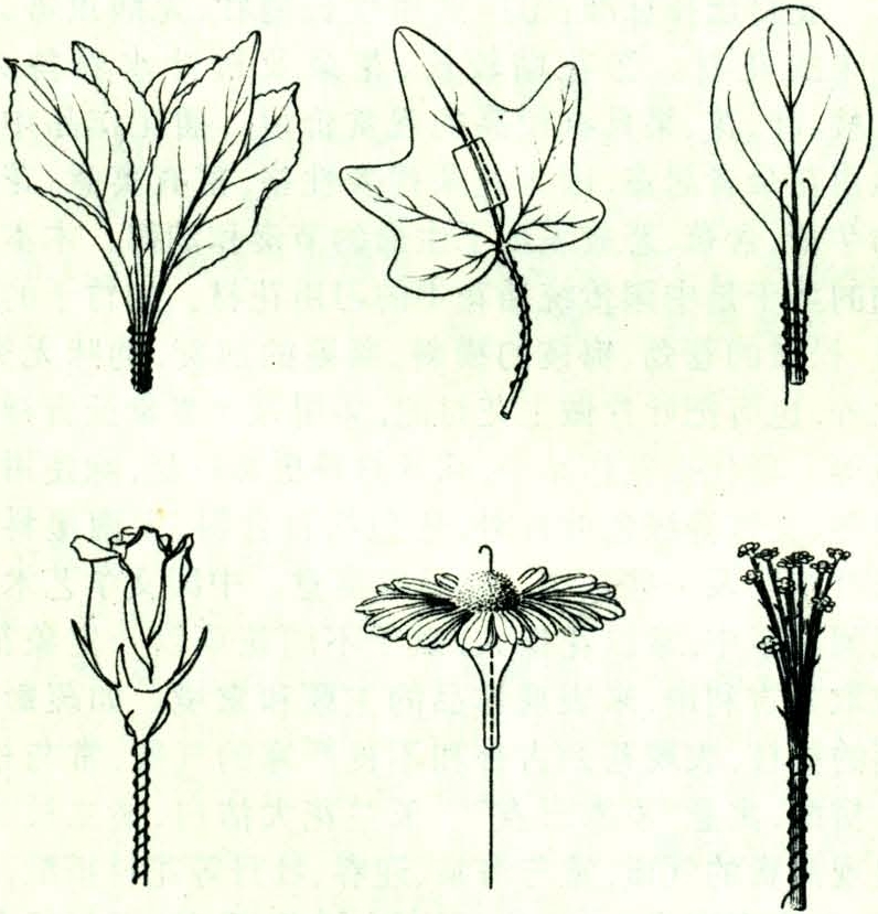 按构图要求,对花材造型加工,改变或矫正枝条的自然曲度或叶片的原有形状。依花材大小、质地不同,方法各异。坚硬粗壮的木本枝条可用刻伤法,在所需部位刻伤1~2个缺口,深度约为枝粗的1/3,顺势弯成所需弧度。纤细柔韧的枝条可在水中用手弯曲。草质茎用手指逐渐揉弯或用铁丝穿入茎内,借助铁丝的力量达到所需曲度。叶片可剪裁、撕裂,用手卷曲或借助大头针、胶带及金属丝等进行造型,如在叶背、叶柄处用胶条与细铁丝粘贴在一起加固,用来改变叶片弯曲度或伸展方向。花朵的造型加固主要方法有:①穿刺加固。将铁丝水平刺入子房,然后折向花梗。②穿茎加固。将铁丝穿入中空或柔软的花梗内。③作环加固。将铁丝弯成环形,托住花头(图1)。固定花材的主要方法:①花泥固定。多用于大口浅盘式容器和花篮。花泥吸水后,按容器大小削成适宜形状,放入容器内。大型作品还应在花泥外包裹金属网罩,把花材基部斜切后插入花泥。②花插固定。多用于艺术插花,适于盘及宽口容器。花插放入容器,将花材插在针座上。依花材茎干质地不同,可直接插入或组合成束插入。木本枝条可将基部剪裂或斜切,扩大断面后插入;茎细弱者可先插在粗茎上,再插于针座。③细口高瓶容器固定。可用下述方法固定花材:折曲花枝,使其靠在瓶内壁,借助瓶壁支撑固定;用小段枝条作成“丁”字、“V”字、“十”字形架,卡在瓶内口以固定花材;把铁丝卷成团或短枝条交错后放入容器固定。此外还有将玻璃球、小卵石放入容器,将花材插入缝隙等固定方法(图2)。(刘 燕)