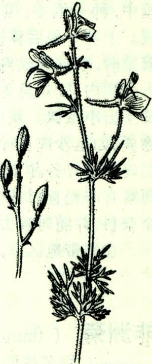 Consolida ajacis,别名千鸟草。毛茛科飞燕草属一二年生草本植物。株高30~60cm,茎直立,上部疏生分枝,茎叶疏被柔毛。叶互生,数回掌状深裂至全裂,裂片条形,茎生叶无柄,基生叶具长柄。总状花序顶生,花径约2.5cm,萼片5,花瓣状,上面一枚长距后伸而上举。花瓣2轮,合生,多与萼片同色。花色有堇蓝、紫、红、粉白等。花期5~6月。蓇葖果,种子千粒重1.88g。有高、矮及重瓣等园艺品种。原产南欧,各地广为栽培。较耐寒,喜高燥,忌积涝,宜深厚肥沃的砂质壤土,需日照充足、通风良好的凉爽环境。用播种法繁殖,发芽适温15℃左右,播种时土温不宜超过20℃,15天萌发。飞燕草为直根性植物,须根少,宜直播,不耐移植。可秋播于冷床越冬,春暖定植,或早春露地直播。果熟期不一致,熟后自然开裂,散出种子,故应及时采收。飞燕草植株挺拔,叶纤细清秀,花序大,着花繁密,花色绚丽,为花境及切花的良好材料。根及种子可入药。(葛红)