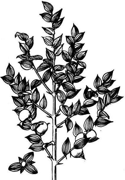 Ruscus aculeatus,百合科假叶树属常绿小灌木。染色体数2n=40。株高30~80cm。根状茎粗壮。叶状枝卵形,先端渐尖,针刺状,基部渐狭成短柄,全缘。花常1~2朵生于叶状枝中脉下部,花期1~5月,果期8~11月,浆果红色。原产欧洲。喜阳也稍耐阴,较耐寒,中国华北地区需入冷室过冬。主要观赏其常绿假叶,用于盆栽及切枝栽培。