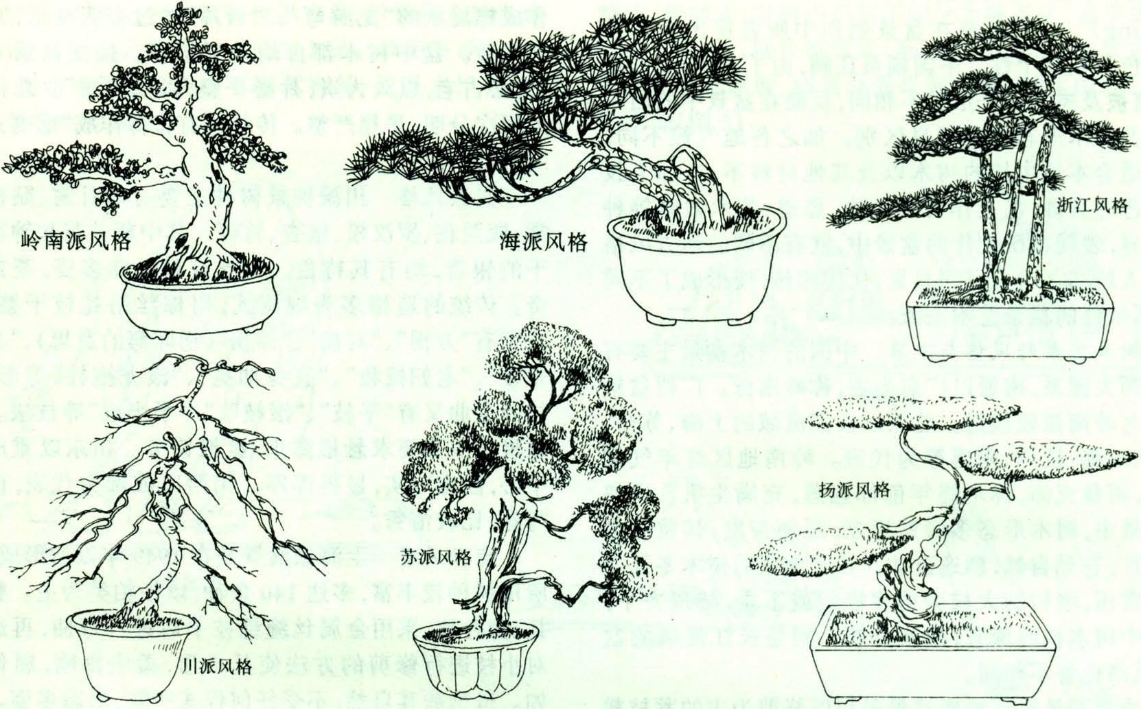 此外,传统的还有主干成“二弯半”向前倾斜的通派(南通)盆景。安徽主干扭旋的柏和游龙式的梅。河南古朴潇洒的柽柳。浙江高干的五针松,它用金属丝和棕丝相结合的方法整形,枝的弯曲长跨度与短跨度结合。福建的榕树气根纷垂,块根奇特似虎踞龙盘。台湾桩景兼有岭南风格和日本风格(见图)。