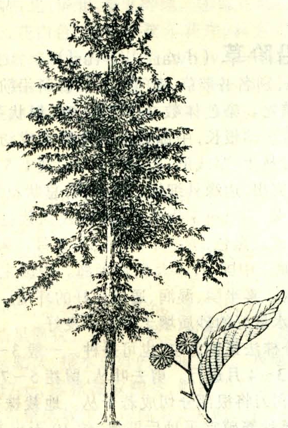 Camptotheca acuminata,别名旱莲、千丈树。蓝果树科喜树属落叶乔木。高达30m,树冠倒卵形,主干耸直。树皮光滑,淡褐色。叶互生,长椭圆状卵形,叶柄红色。花单性同株,头状花序具长柄,雌花序顶生,雄花序腋生,6~7月开淡绿色花。瘦果长三菱形,有狭翅,11月成熟时褐色。分布于中国长江流域以南和西南地区。