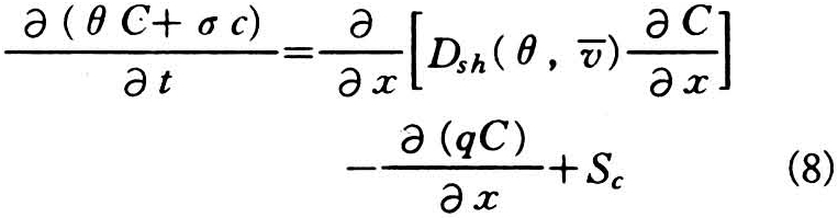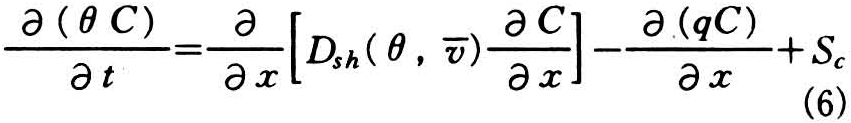 考虑发生在土壤中的某些生物学反应,可能会生成一些溶质,或使某些溶质消失(如有机质矿化产生盐类,植物吸收使某些盐类消失等),则可在基本方程(3)中加上一个复合的源汇项Sc,即