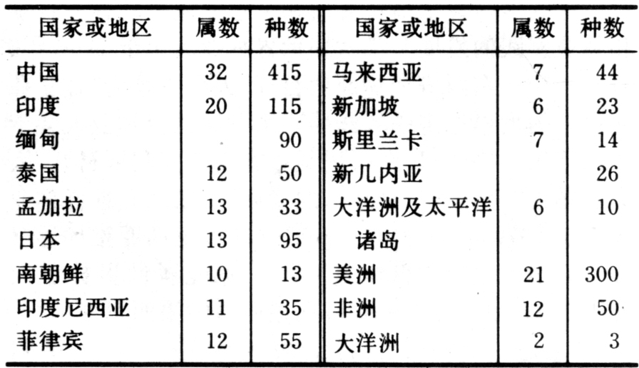 竹子的适应能力较强,天然分布很广,除欧洲外,其他各大洲均有分布(见表)。从赤道至寒温带,从平原、丘陵至高山雪线都能生长,但主要分布在热带亚热带雨量充沛的平原丘陵地区。世界竹类植物的地理分布可分为三大竹区,即亚太竹区、美洲竹区和非洲竹区。各大竹区之内,又因气候和竹种不同,可分为若干小区或亚区。欧洲没有乡土竹种,都是引自亚洲、美洲和非洲各地。①亚太竹区:南至新西兰(南纬40°),北至库页岛中部(北纬51°),东至太平洋诸岛,西至印度西南部。东南亚地区是世界竹类植物的分布中心。亚太地区的竹类植物40余属,700多种,合轴型约占2/3,单轴型和复轴型共约占1/3。不少属、种是各国共有的。中国的竹种最多,有32属,400多种,合轴型过半,其余为单轴型和复轴型。日本、南朝鲜的竹类植物主要是单轴型和复轴型,而东南亚各国及太平洋岛屿则为合轴型竹种。其中秆形粗大、材质优良而有经济价值的约100种。②美洲竹区:跨越南北美洲,南至阿根廷南部(南纬46°),北至美国东部(北纬40°),共约21属,300多种,主要分布在南北美洲大陆的东侧,而以中美地区为分布中心。复轴型的青篱竹属竹种分布在美国东部。其余20属均为合轴型(Chusquea亚属有部分竹种为单轴型),都分布在拉丁美洲。除数种秆形较大外,其余是草状竹类,没有经济价值。③非洲竹区:南至莫桑比克南部(南纬22°),北至苏丹东部(北纬16°),从西岸的塞内加尔南部,横跨非洲热带雨林和常绿落叶混交林,直至东海岸的马达加斯加岛,形成从西北至东南的斜长地带。据现有记录,非洲大陆的乡土竹种有12属,而在马达加斯加岛则有11属近40种。箣竹属和青篱竹属是世界属。前者的竹种分布在各大洲的热带地区,后者的竹种则分布在亚热带和暖温带地区。龙头竹是世界竹种,又被称为泛热带竹种。按竹类植物的区系组成,亚太和非洲两大竹区有很多属是相同的,表明它们之间竹类植物的亲缘关系。