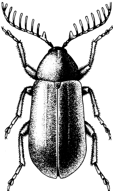 学名:Ptilinus fuscus Geoffroy。鞘翅目,窃蠢科。成虫体长3.5~5.5毫米,黑褐色,被污黄色绒毛;雌虫触角第四至十一节锯齿状,雄虫触角第三节齿状,4~11节梳状,第十一节的栉齿最长,长度相当于第七至十节主干的总长;前胸背板圆凸,中央有1条细凹线,前缘稍翘起,中段具小齿列(见图)。卵白色,长卵圆形,长约0.3毫米幼虫乳白色,蛴螬型,体长6~7毫米,被稀疏短毛。蛹乳白色,裸蛹,体长约5毫米,复眼黑褐,上颈红褐,腹背中央有纵向锐脊。分布中国辽宁、青海、甘肃;叙利亚,阿拉伯联合酋长国及欧洲。为害杨、柳干材。两年1代。除成虫期有一段短暂暴露活动外,其他虫期都在木材内生活。通常6月中下旬至7月上中旬为成虫出现盛期。成虫白天多在干材表面活动,间或作短距离飞翔。交配后的雌成虫蛀孔钻入材内产卵,每雌产卵40~50粒。幼虫在材内为害,可深入心部。防治方法:在成虫出现期,喷洒80%敌敌畏200~400倍液4~5次,坚持防治4年;释放管氏肿腿蜂,以寄生潜藏于木材深层的幼虫和蛹。