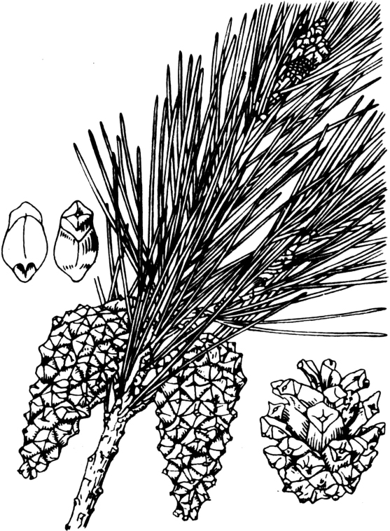 常绿乔木,高达25米,胸径达80厘米。树皮深裂,呈鳞状块片脱落,下部灰褐至黑褐色,上部黄色至褐黄色;内皮金黄色。幼树树冠尖塔形,老树圆顶或平顶,树冠稀疏。1年生枝淡黄渴色。冬芽渴色或淡黄褐色。针叶二针一束,扁而粗硬,常扭曲,长4~9厘米,径1.5~2毫米,边缘有细锯齿,两面均有气孔线;边生树脂道6~11;叶鞘宿存,黑褐色。球果卵圆形或长卵圆形,长3~6厘米,径2~3厘米,成熟时淡褐灰色;鳞盾肥厚隆起,纵脊横脊显著,鳞脐呈瘤状突起,有易脱落的短刺。种子黑褐色,长卵圆形或倒卵圆形,微扁,长4.5~5.5毫米,连翅长11~15毫米。花期5~6月,球果第二年9~10月成熟,第三年4月球果开裂。