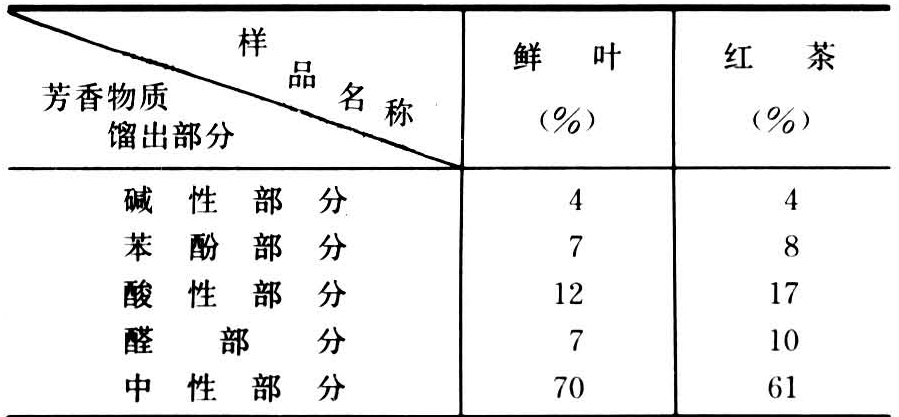 茶鲜叶挥发性化合物低于干重的0.1%,按现有的提取方法所得芳香物质,鲜叶为0.03~0.05%,绿茶为0.02%左右,红茶为0.03%左右。春茶含量较夏、秋茶高。