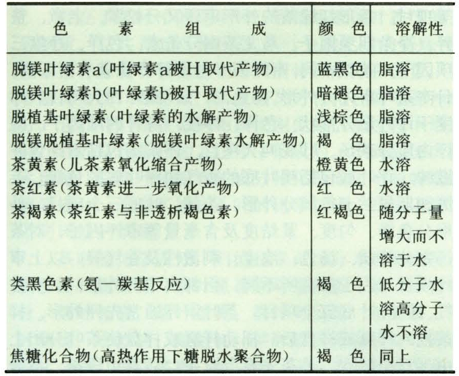 构成茶叶外形色泽与茶汤颜色的化学物质,是茶叶中所含酯溶性色素和水溶性色素,都具有不同的光学性能。因各种茶类所含色素种类、数量、比例不同,而形成不同的外形色泽与汤色。