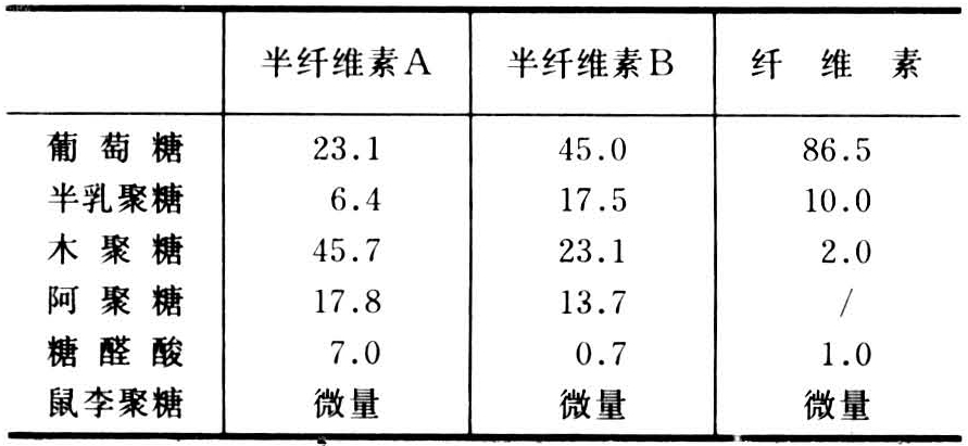 由许多个单糖分子脱水缩合而成的糖类。茶树体内的多糖有纤维素、半纤维素、淀粉和果胶物质等。茶鲜叶中纤维素含量为干物的4.33~8.85%。嫩叶中纤维素含量较低,成熟叶及老叶中较高。茶叶中纤维素含量,可作为老嫩度的指标,是评价茶叶品质的参数之一。半纤维素不溶于水,而能溶于17.5%NaOH或KOH中的一类酸性多糖。茶叶中半纤维素是由葡萄糖、半乳聚糖、木聚糖、阿聚糖、糖醛酸和微量的鼠李聚糖等所组成(见表),半纤维素水解时可得到葡萄糖、半乳糖、木醛糖、阿拉伯醛糖和鼠李糖等。茶叶中半纤维素含量随叶片的老化而增加,一般嫩叶中含量在3%以下,而老叶可达9%以上。半纤维素和纤维素、木质素共同组成细胞壁。半纤维素又是贮藏物质,种子萌发时可用作营养物质利用。