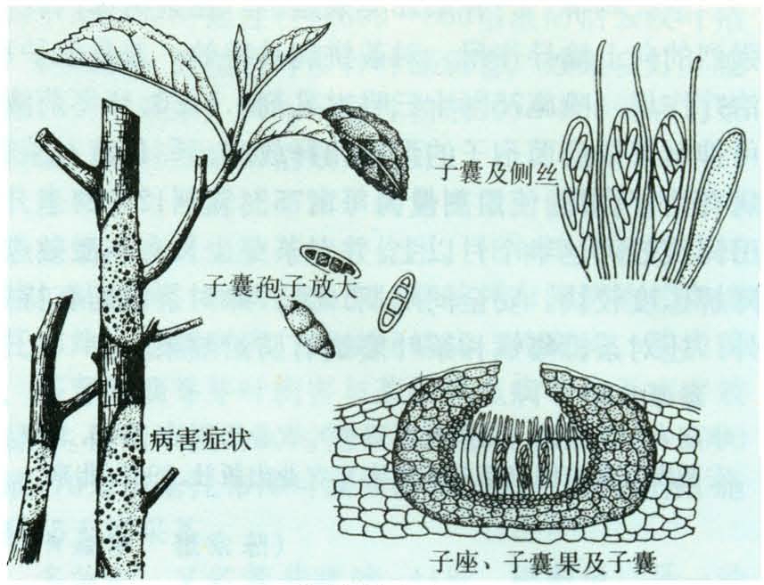 发病初病斑呈边缘褐色、中央灰白色的小斑,以后渐扩大,大小不一,上面散生有漆黑色、圆形突起的小点。病斑形状不规则,病、健部分界不明显,病斑常包围枝干致树势衰弱。