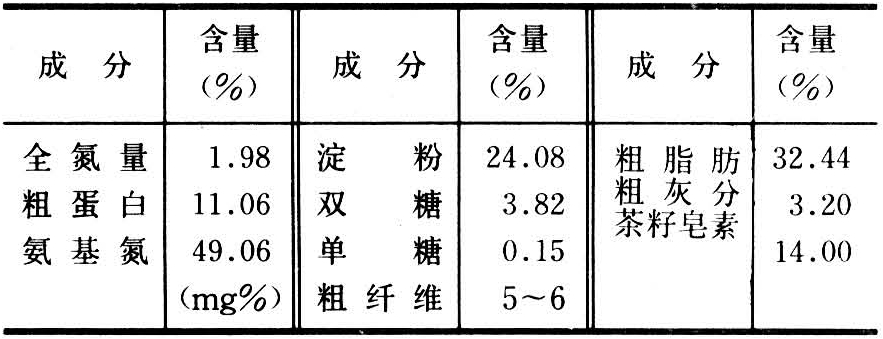 成熟的茶籽中含有约40%的水分。干物质中种壳约占32%,种仁约占67%,种仁的化学成分如表: