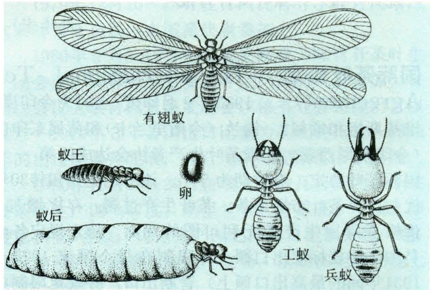 茶树根茎害虫之一,又名黑翅大白蚁、台湾黑翅大白蚁,俗称白蚂蚁,属等翅目白蚁科,学名为Odon-totermes formosanus Shiraki。分布与为害国内分布很广,最北至洛阳一带。蚁群在地下蛀食根部,并有泥道通至地上蛀害枝干,除茶树外,还为害松、杉、油茶等多种林木。形态 黑翅土白蚁属多型性昆虫,分有翅型的雌、雄生殖蚁(蚁后、蚁王)和无翅型的非生殖蚁(兵蚁、工蚁)等。