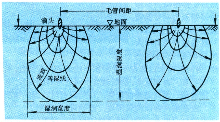 在质地较均匀的土壤中,入渗初期的湿润区常呈半球形,后期则逐渐演变为半椭球形,土壤质地愈粗,这一演变过程进行得越快。当形成的湿润宽度不能达到规定要求时,应缩小滴头间距,增加滴头数量,同时缩短灌水历时,以便减少湿润深度,增加湿润面积。