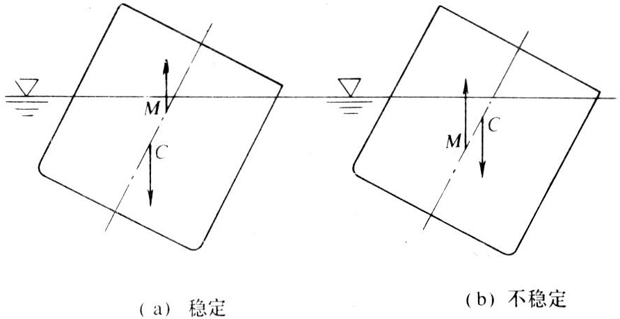 飘浮于液体表面的物体。浮体一方面受到重力的作用,同时又受到周围液体对它的作用力。液体对浮体的作用力的合力称为浮力。浮力的方向是竖直向上的,大小等于被物体排开的液体的重量,作用线通过排开液体体积的形心,又称为浮心。这就是著名的阿基米德原理。当物体所受向上的浮力与向下的重力大小相等、且物体的重心与浮心在同一条垂线上时,浮体是平衡的。浮体受到外界扰动(如风浪的作用)后会发生倾斜,在外界扰动消失后,浮体回复到原来平衡状态的能力,称为平衡的稳定性。浮体在平衡时和微倾后两位置时浮力作用线的交点M称为定倾中心,当M点高于重心C点(如图a所示),重力与倾斜后的浮力构成一个使浮体恢复到原来平衡位置的转动力矩,浮体处于稳定平衡。反之(如图b所示),则上述两力将构成一个使浮体有更加倾倒趋势的转动力矩,浮体处于不稳定平衡。