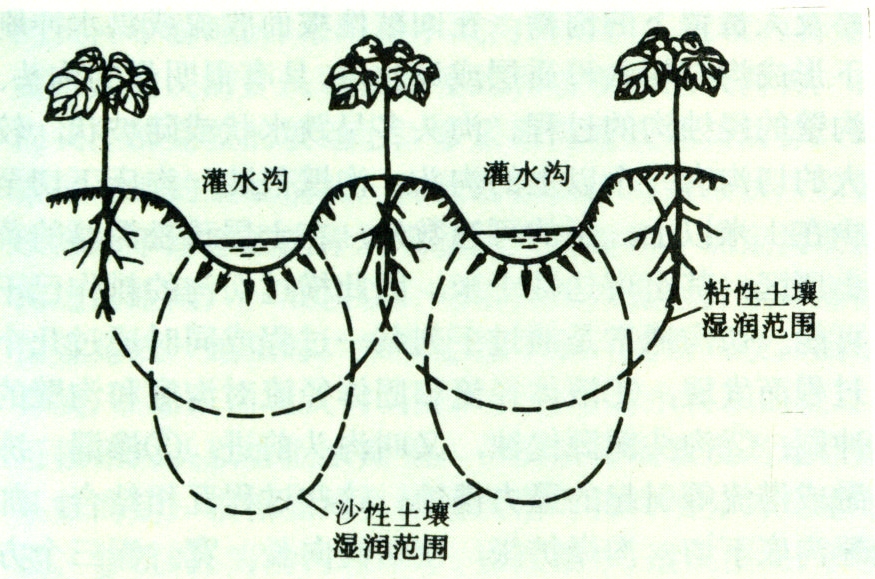 水在作物行间的灌水沟中流动,靠重力与毛管作用湿润土壤的一种灌溉方法(见图)。