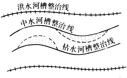 整治线的平面形式 河道经过整治后,在设计流量下的平面轮廓线,称为河道整治线。整治线是布置整治建筑物的重要依据。平原河道整治线有:①洪水河槽整治线。洪水河槽由主河槽和滩地两部分组成。洪水河槽整治线即两岸堤防的平面轮廓线。堤线与主河槽岸坎线之间,应根据宣泄设计洪水和防止堤岸冲刷的需要,经过分析研究,留有足够的洪水滩地宽度。②中水河槽整治线。是对河势起控制作用的整治线。中水河槽岸坎线的平面形式随不同河型而异。中水河槽的整治线,一般应为曲率适度的连续曲线,曲线之间以适当长度的直线联接。对于不能形成单一河槽的河道,例如游荡型河道、分叉型河道,则应控制使其主流的整治线为曲率适度的连续曲线。设计整治线的曲率时,应采用圆顺的曲线。曲线的弯曲半径在弯顶最小,弯顶上、下游逐渐增大,在上、下游过渡段为无穷大,中水河槽整治线的弯曲半径和曲线之间直段的长度,可参考河道中水文、泥沙、地质条件与整治河段相似的优良河段资料,选用设计数据。所谓优良河段,是指河段岸线规则、曲线圆顺,曲线段之间的直线段长度适宜,洪、中、枯水期的主流稳定,流向基本一致,水流集中,没有分叉现象,并经长期观测证明,防洪、航运等条件较好的河段。当缺乏优良河段资料参考时,最小弯曲半径,可取本河道直线段平滩河宽的4~9倍,曲线段之间的直线长度,可取本河道直线段平滩河宽的1~3倍。③枯水河槽整治线。一般应在中水河槽整治线的基础上,根据航道和取水建筑物的要求,充分利用稳定深槽、边滩或江心洲进行设计。为了保持航道稳定,要求整治后的枯水河槽流向与洪、中水河槽流向的交角不大。枯水河槽整治线的最小弯曲半径较中水河槽整治线的为小,可参考优良河段资料选用;缺少优良河段资料时,最小弯曲半径,可取本河道直线段枯水河宽的4~9倍。枯水河槽曲线段之间的直线段长度,一般较中水河槽的直线段稍长。对于通航河道,中水河槽、枯水河槽整治线的最小弯曲半径应不小于顶推船队长度的三倍,拖带船队最大单船长度的四倍;曲线段之间的直线长度应不小于船队长度的1~2倍。平原河道洪、中、枯河槽整治线如图。
