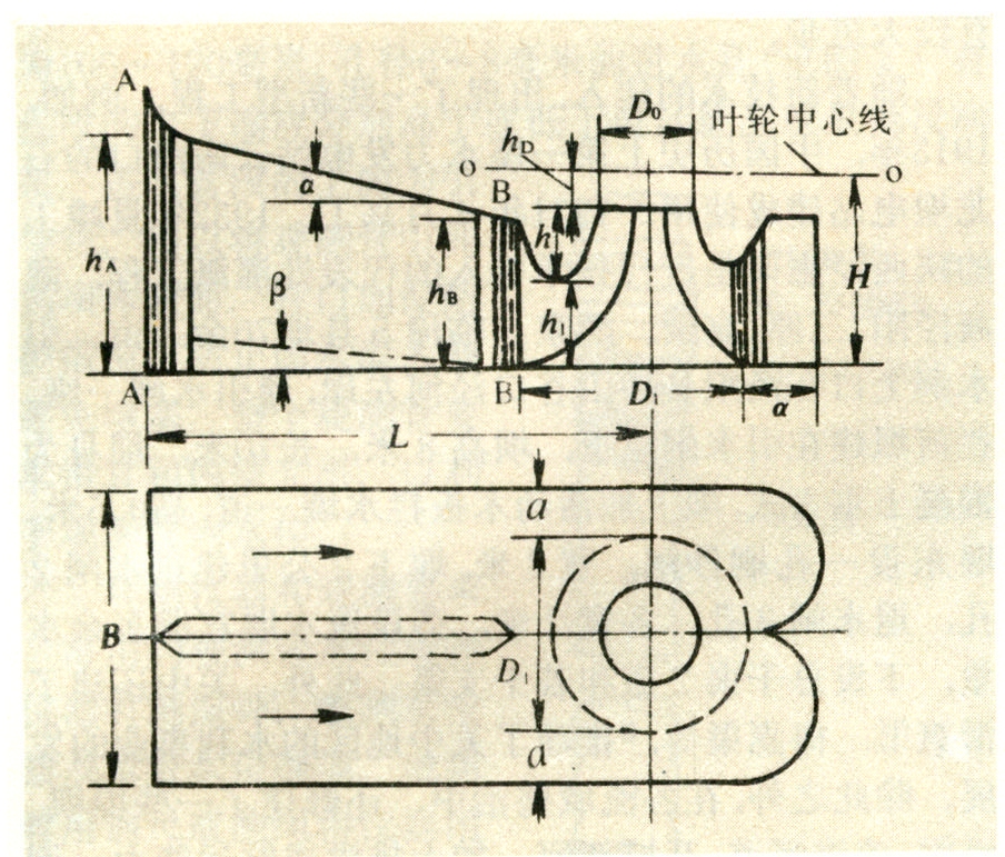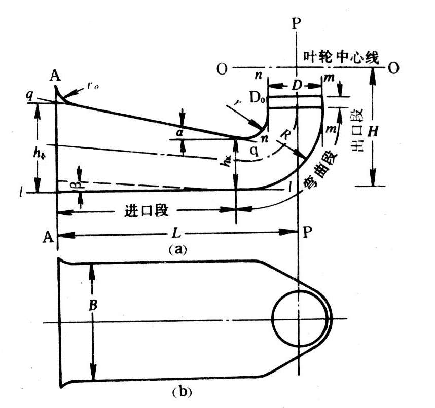 其形状象人的胳膊肘(图1),是块基型泵房中最常见的一种进水流道形式。它由进口段、弯曲段和出口段组成其断面形状由方变圆并和水泵进口的座环相接。其基本特征值为:H/D=1.5~1.8;L/D=3.6~4.0;B/D=2.0~2.5;α<20°~25°