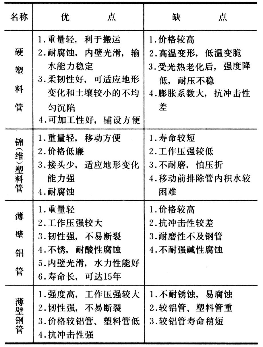 移动管道都是季节性使用,且工作条件恶劣,所以除满足一般压力水管的要求外,尚需考虑温度、老化、冲击、腐蚀等因素,以及运移和安装方便。移动管道的管材多采用金属管和塑料管,个别情况用橡胶管。①金属管:均采用薄壁管,即直径与壁厚的比值大于50的管材,常用的是薄壁铝管和薄壁镀锌钢管。薄壁管多在半固定和移动式喷灌系统中作地面移动管道,也在滚移式喷灌机上作喷洒支管用。薄壁镀锌钢管还可在时针、平移等多支点喷灌机上作喷洒管。②塑料管:用于喷灌的有聚氯乙烯管、高压及低压聚乙烯管、改性聚丙烯管和锦(维)纶涂塑软管等。其中低压聚乙烯管是半软管,用于软管牵引绞盘式喷灌机,其他多作为地面移动管用。薄壁金属管和塑料管的优缺点见表。③橡胶管:喷灌用的橡胶管主要是合成橡胶软(半软)管,多用作钢索牵引绞盘式喷灌机的输水管,以及在各类机组式喷灌系统中作供水管用。