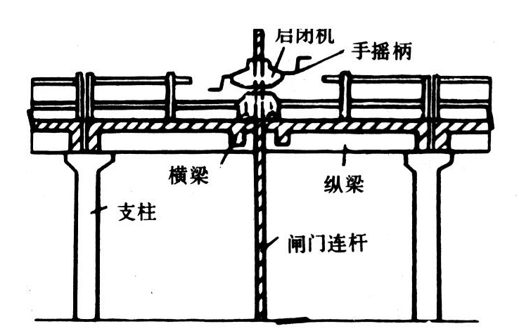 装置及操作闸门启闭机设备的平台,简称启闭台,水闸的启闭台常支承于闸墩上,若启闭台较高,加高闸墩不经济时,则可在墩上建支架或支柱,将启闭台置于支架上。启闭台高程应满足闸门全开的运用要求,例如,图1为装置固定式启闭机的启闭台,用于启闭平面直升式闸门。当不设胸墙时,为了使闸门全开后形成堰流,应按启闭台横梁底部高程与过流时最高水位的差值大于闸门高度的原则,确定启闭台的高程。图2为升卧式闸门的闸室布置,闸槽两侧设置由直线与曲线相接的导槽,全开时闸门平卧于启闭台底下,这种布置可以有效地降低启闭机台的高度。隧洞、涵管、坝内底孔等高水头过水建筑物的启闭台,一般置于进口的启闭塔(井)上,其高程可按防洪标准确定。启闭台的平面尺寸根据启闭机的型号及运行要求决定。小型水闸的启闭机台一般采用板式结构;大、中型水闸及隧洞、涵管的启闭机台多采用板梁结构。梁系的平面布置应与启闭设备的安装尺寸及运用要求相适应,梁、板截面可按钢筋混凝土构件设计。有些大、中型水闸的启闭机台还应采用拱式结构和桁架拱式结构。