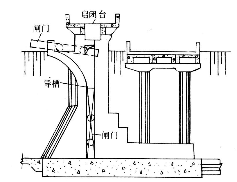 槽两侧设置由直线与曲线相接的导槽,全开时闸门平卧于启闭台底下,这种布置可以有效地降低启闭机台的高度。隧洞、涵管、坝内底孔等高水头过水建筑物的启闭台,一般置于进口的启闭塔(井)上,其高程可按防洪标准确定。启闭台的平面尺寸根据启闭机的型号及运行要求决定。小型水闸的启闭机台一般采用板式结构;大、中型水闸及隧洞、涵管的启闭机台多采用板梁结构。