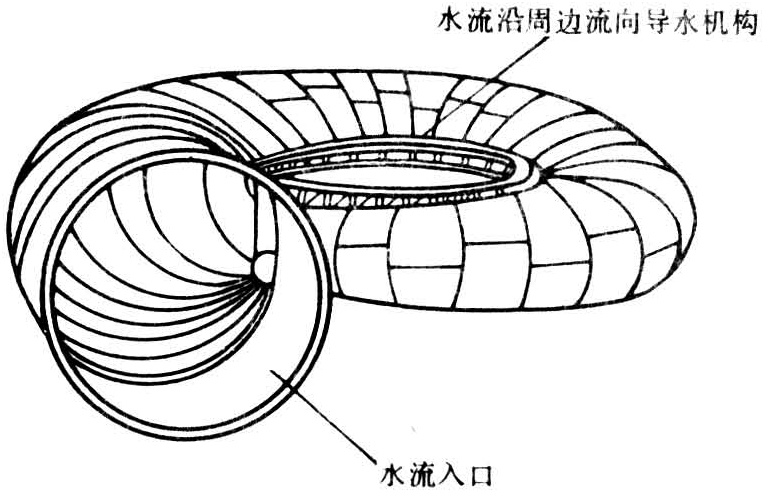 使水流以最小的水力损失均匀对称地流入导水机构的、外形呈蜗牛壳状的水轮机进水部件。它是一个过水断面逐渐变小的“管子”,包围在水轮机座环的外围,蜗壳内侧与座环相接通(图1)。水流从压力水管进入蜗壳后,一方面绕主轴作圆周运动,另一方面又沿径向运动流入导水机构。目前混流式、轴流式和斜流式水轮机都广泛应用蜗壳,蜗壳分为金属蜗壳和钢筋混凝土蜗壳。水头小于40米时,大多采用混凝土蜗壳。