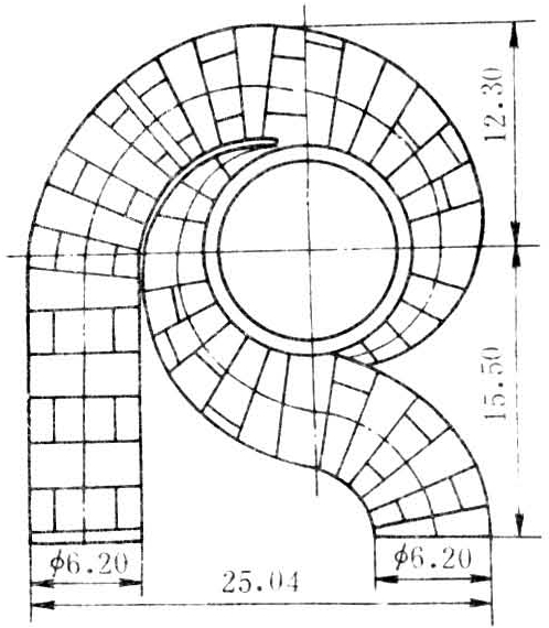 近年来,在巨型水轮机上有采用“双蜗壳”的趋势。每一蜗壳供水半个圆周(图3)。双蜗壳的进口断面直径比一般蜗壳减小1/3左右,蜗壳钢板厚度也相应减小。