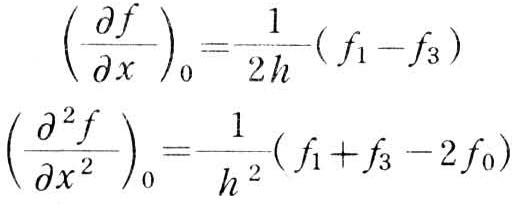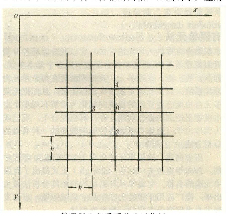 应用有限差分法,首先要求在微分方程的定义域上绘出等间距的平行坐标轴的网格,如图所示。应用泰勒级数展开式,略去其中三阶以上的余项,就可以将结点o处的x向导数用结点的函数值fi和网格间距h来表示,即