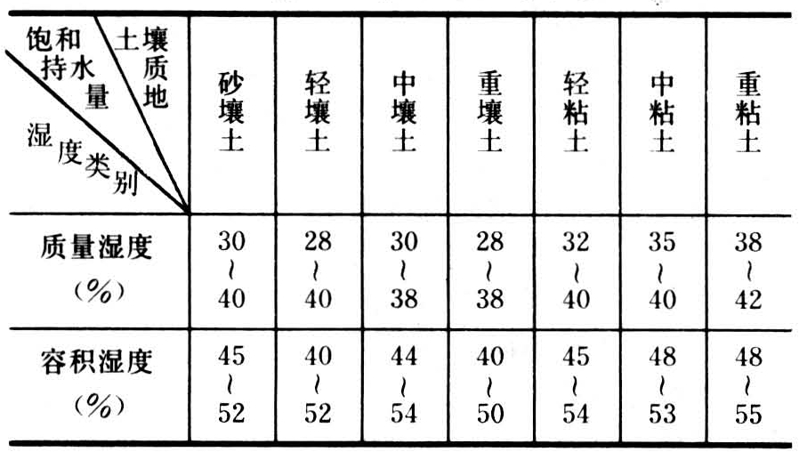 饱和持水量的数值决定于土壤孔隙度,不同质地土壤饱和持水量如表。
